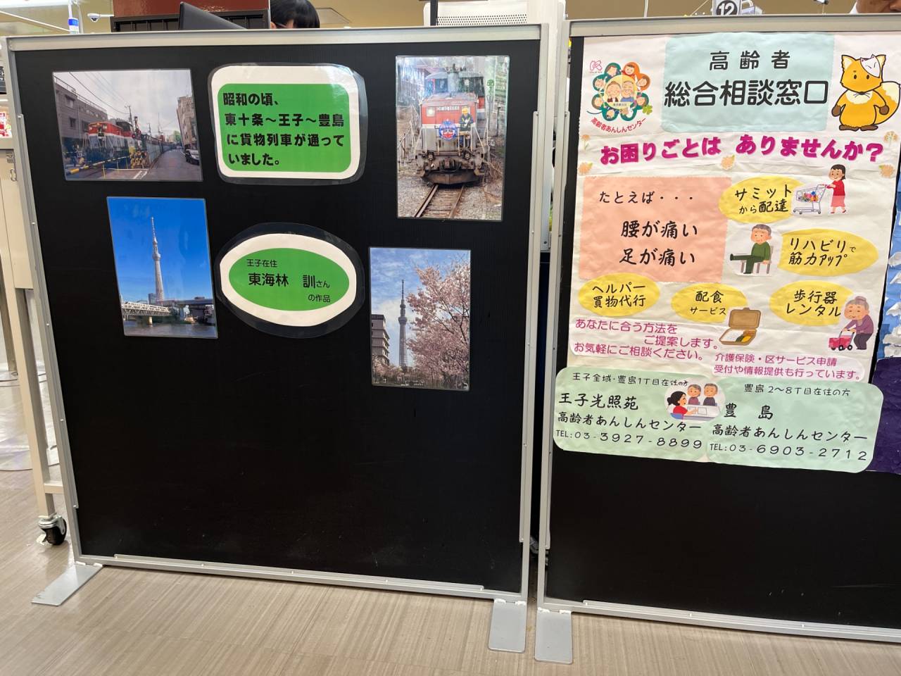 サミット王子店(王子6丁目)のサミカフェ近くに、光照苑デイサービスの作品やあんしんセンターの相談ポスター、地域の方の写真を掲示していただきました。