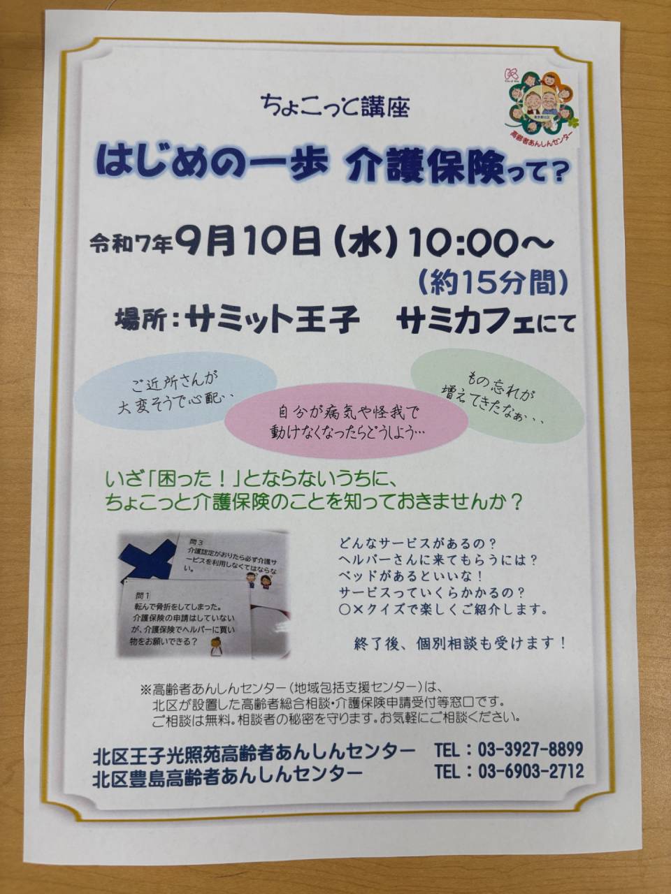 また、9月10日(水)10時~ちょこっと講座「はじめの一歩 介護保険って」を15分程度行います。そのあとはご希望者には個別相談もお受けいたしますので、お気軽にお越しください。