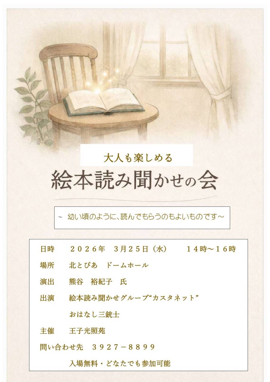 『絵本読み聞かせ会』(3/25)を開催します【高齢者あんしんセンター】 2026/03/06 絵本読み聞かせグループ『カスタネット』による絵本読み聞かせの会が開催されます。 日時:3月25日(水) 14時~16時 場所:北とぴあ ドームホール ☆入場無料 ☆入退場自由 皆様の来場、お待ちしております!